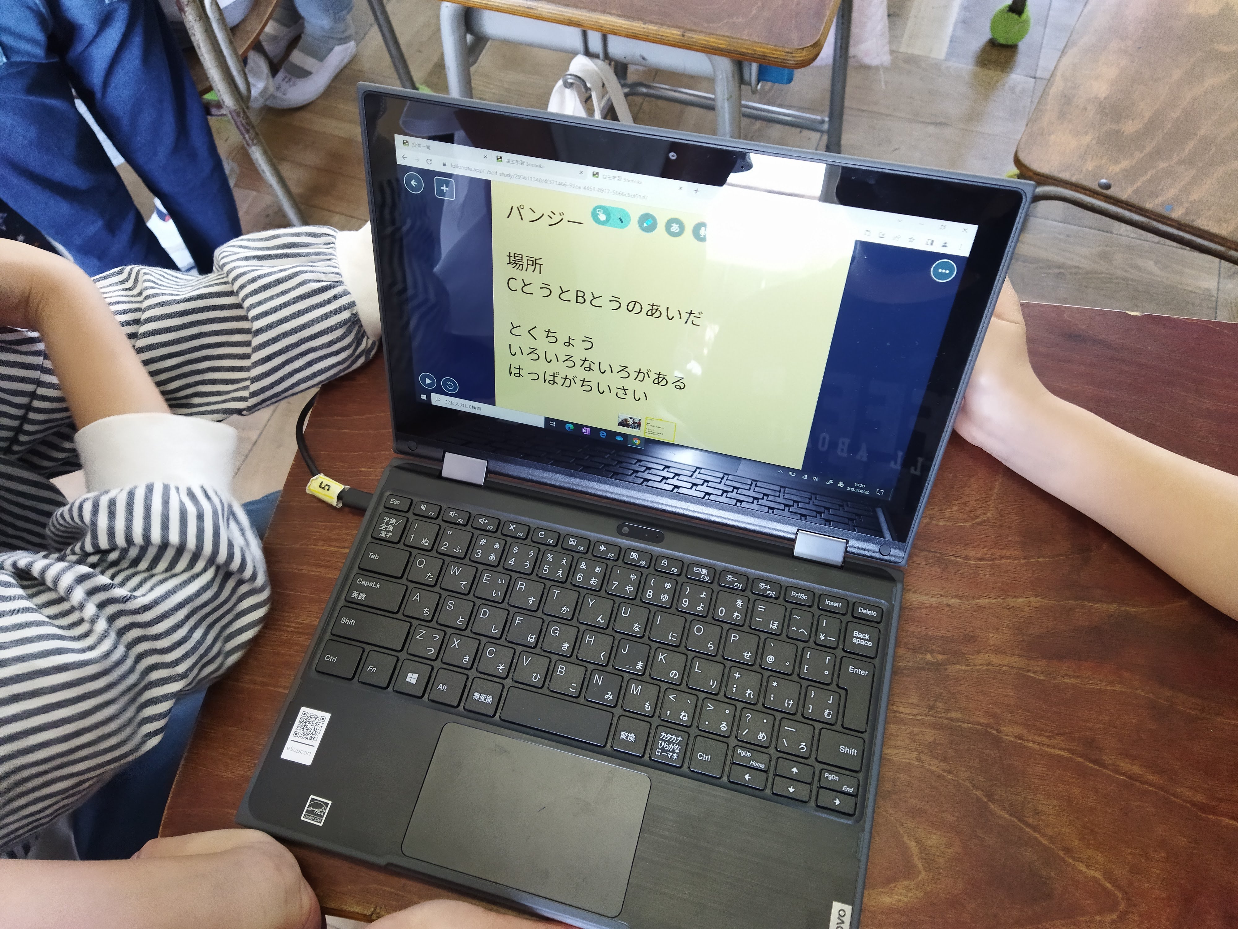 個々に活用するだけでなく、グループで一つの端末を囲んで話し合いをしながらまとめることもします。