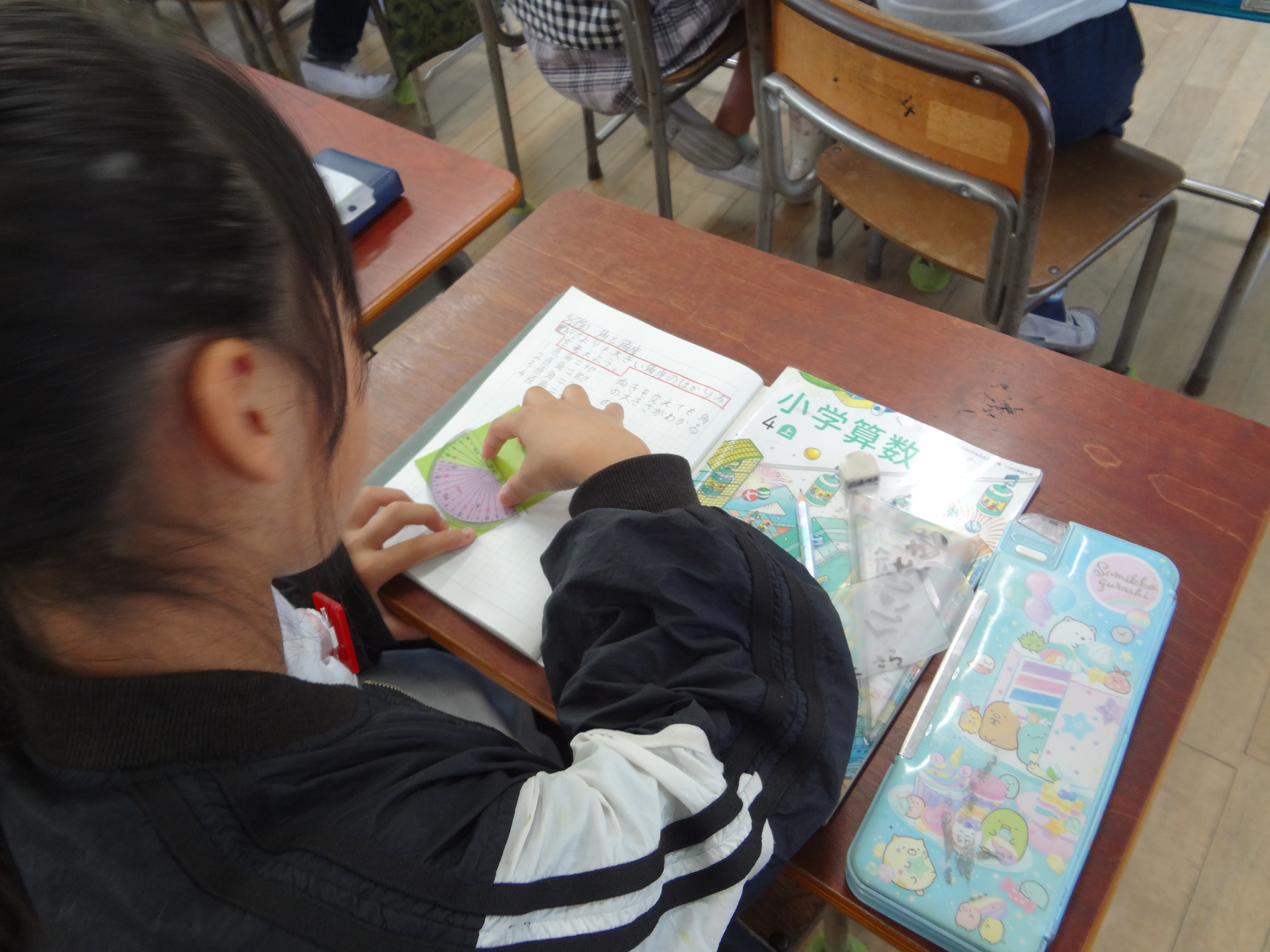 四角形の内角の和を求めている5年生。どのように考えたらいいかを話し合っています。